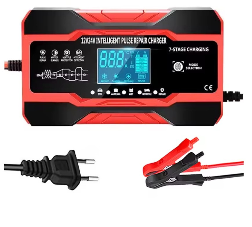 A 12V-24V 10A-5A-s LCD kijelzős intelligens akkumulátor töltő Lead-Acid/AGM/GEL/SLA/WET/CYCLE/EFB/ólom-savas motorkerékpár és gépkocsi akkumulátorokhoz. Intelligens észlelés, intelligens felismerés, intelligens védelem és automatikus leállítás teljesen feltöltött állapotban. Válassza ki az üzemmódot, csatlakoztassa az akkumulátort a 12V/24V töltés automatikus felismerése és átalakítása emiatt egyszerű a kezelése. Egy kattintásos javítás: válassza ki a javítási módot, lehet feszültségszegény akkumulátoron, üresjárati akkumulátoron. Ne töltsön az akkumulátorba, jó javítási aktiváló hatása van! Az új, nagy képernyős kialakítás az akkumulátortesztelési eredmények intuitívabb megjelenítését teszi lehetővé, lehetővé téve az aktuális feszültség, áram, akkumulátor töltöttségi szint, hőmérséklet, téli/nyári üzemmód és egyebek ciklikus megjelenítését. Többszörös védelem: fordított védelem, rövidzárlat elleni védelem, túláramvédelem, túlmelegedés elleni védelem, túlfeszültség elleni védelem, alacsony feszültség elleni védelem, áramütés elleni védelem, tűzvédelem, kényelmesebb használatot tesz lehetővé.