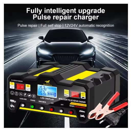 12V-12A 24V-9A LCD kijelzős akkumulátor intelligens töltő AGM/GEL/SLA/WET/CYCLE/EFB/ólom-savas motorkerékpár és gépkocsi akkumulátorokhoz. Intelligens észlelés, intelligens felismerés, intelligens védelem és automatikus leállítás teljesen feltöltött állapotban. Válassza ki az üzemmódot, csatlakoztassa az akkumulátort a 12V/24V töltés automatikus felismerése és átalakítása emiatt egyszerű a kezelése. Egy kattintásos javítás: válassza ki a javítási módot, lehet feszültségszegény akkumulátoron, üresjárati akkumulátoron. Ne töltsön az akkumulátorba, jó javítási aktiváló hatása van! Az új, nagy képernyős kialakítás az akkumulátortesztelési eredmények intuitívabb megjelenítését teszi lehetővé, lehetővé téve az aktuális feszültség, áram, akkumulátor töltöttségi szint, hőmérséklet, téli/nyári üzemmód és egyebek ciklikus megjelenítését. Többszörös védelem: fordított védelem, rövidzárlat elleni védelem, túláramvédelem, túlmelegedés elleni védelem, túlfeszültség elleni védelem, alacsony feszültség elleni védelem, áramütés elleni védelem, tűzvédelem, kényelmesebb használatot tesz lehetővé.