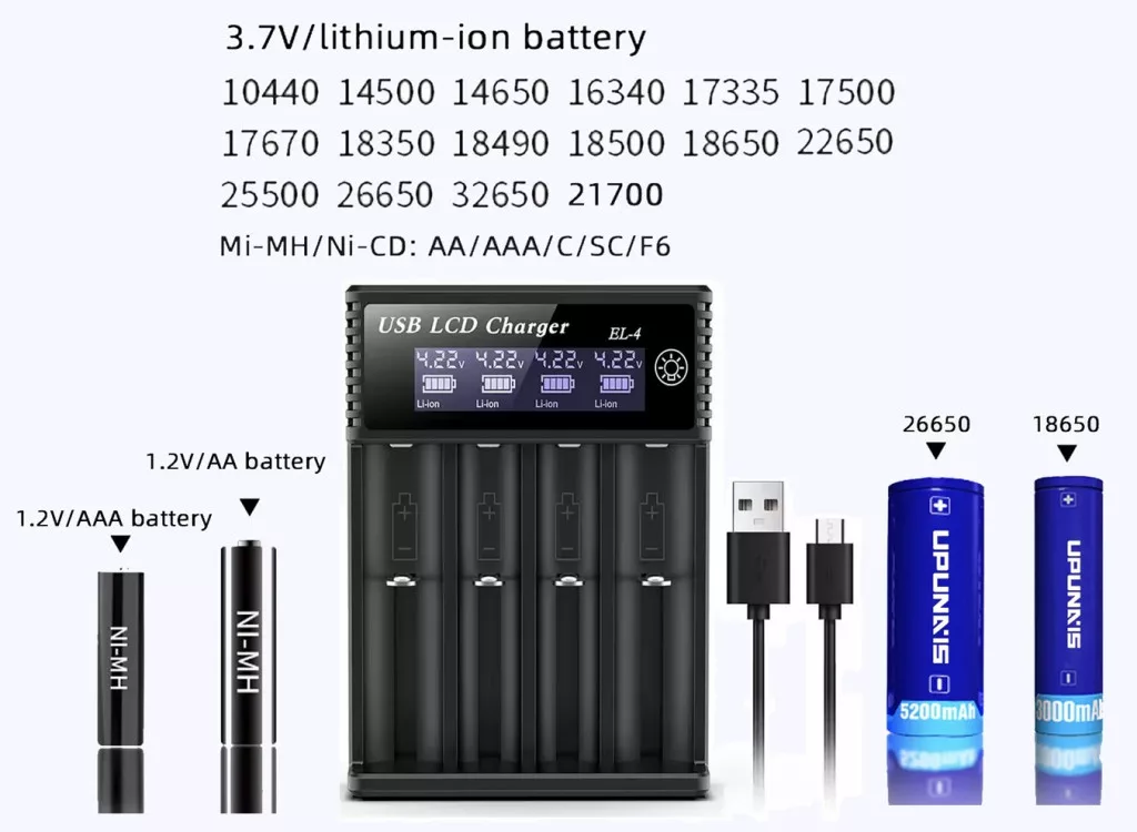 - Támogatott akkumulátorok: 1-4x 3,7 V Li-ion akkumulátorok, védett (PCM / PCB-vel) és nem védett, valamint 1,2V Ni-MH/Ni-CD tölthető elemek