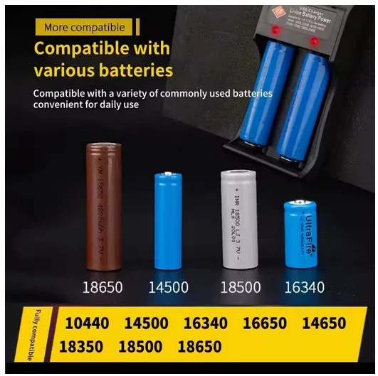A következő lítium akkumulátorokkal kompatibilis: 2 foglalat 10440,14500,16340,16650,14650,18350,18500,18650