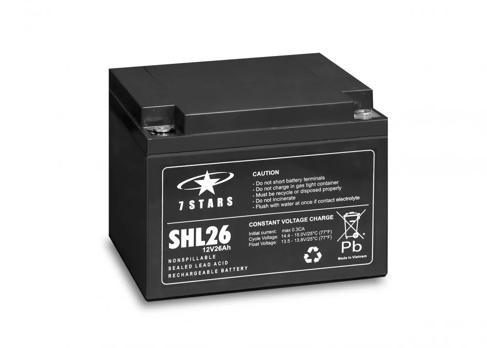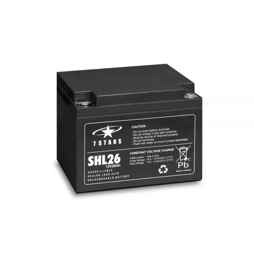 A 7 Stars SHL26-12 egy 12V-os, 26Ah kapacitású, zárt ólom-sav akkumulátor, amelyet elsősorban szünetmentes tápegységekhez (UPS) terveztek. AGM (Absorbent Glass Mat) technológiával készült, amely gondozásmentes működést és hosszú élettartamot biztosít. A gyártó által megadott tervezett élettartam 10 év.