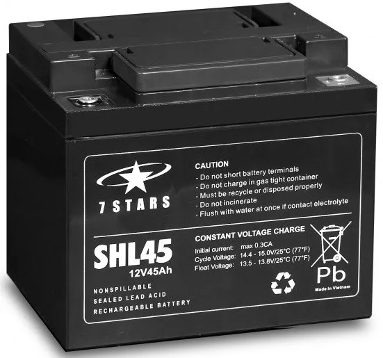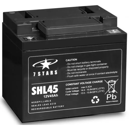A 7 Stars SHL45-12 egy 12V-os, 45Ah kapacitású, zárt ólom-sav akkumulátor, amelyet elsősorban szünetmentes tápegységekhez (UPS) terveztek. AGM (Absorbent Glass Mat) technológiával készült, amely gondozásmentes működést és hosszú élettartamot biztosít. A gyártó által megadott tervezett élettartam 10 év.