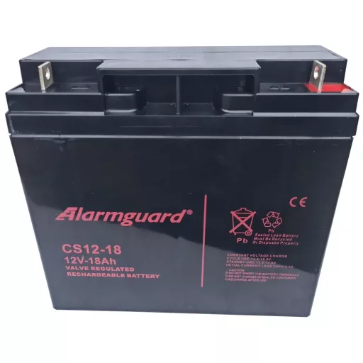 Alarmguard CS12-18 12V 18Ah-s zártrendszerű, AGM technológiás, szeleppel vezérelt (VRLA), ismételten újratölthető gondozásmentes (zselés) ólomsavas akkumulátor. Szigetelt tömítéssel vízszintes, függőleges és oldalsó irányban is elhelyezhető így biztonságát és funkcióit ez nem befolyásolja. Várható élettartama 3-5 év (Standby - Készenléti üzemmódban 5 év), mely nagyban függ a környezeti hőmérséklettől, felhasználási területtől, terheléstől. Felhasználási terület: riasztó és tűzvédelmi rendszerek, tápegységek, etetőhajók, gyerekjátékok, lámpák ... stb.