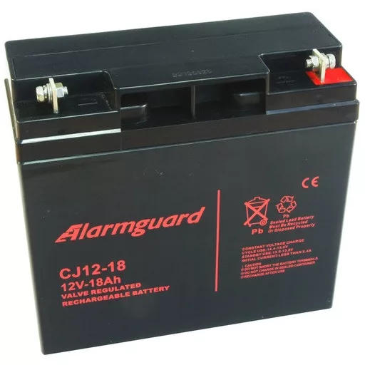 Alarmguard CJ12-18 12V 18Ah-s zártrendszerű, AGM technológiás, szeleppel vezérelt (VRLA), ismételten újratölthető gondozásmentes (zselés) ólomsavas akkumulátor. Szigetelt tömítéssel vízszintes, függőleges és oldalsó irányban is elhelyezhető így biztonságát és funkcióit ez nem befolyásolja. Várható élettartama 3-5 év (Standby - Készenléti üzemmódban 5 év), mely nagyban függ a környezeti hőmérséklettől, felhasználási területtől, terheléstől. Felhasználási terület: riasztó és tűzvédelmi rendszerek, tápegységek, etetőhajók, gyerekjátékok, lámpák ... stb.