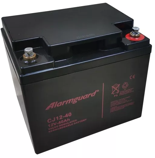 Alarmguard CJ12-40 12V 40Ah-s zártrendszerű, AGM technológiás, szeleppel vezérelt (VRLA), ismételten újratölthető gondozásmentes (zselés) ólomsavas akkumulátor. Szigetelt tömítéssel vízszintes, függőleges és oldalsó irányban is elhelyezhető így biztonságát és funkcióit ez nem befolyásolja. Várható élettartama 3-5 év (Standby - Készenléti üzemmódban 5 év), mely nagyban függ a környezeti hőmérséklettől, felhasználási területtől, terheléstől. Felhasználási terület: riasztó és tűzvédelmi rendszerek, tápegységek, etetőhajók, gyerekjátékok, lámpák ... stb.