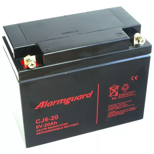 Alarmguard CJ6-20 6V 20Ah-s zártrendszerű, AGM technológiás, szeleppel vezérelt (VRLA), ismételten újratölthető gondozásmentes (zselés) ólomsavas akkumulátor. Szigetelt tömítéssel vízszintes, függőleges és oldalsó irányban is elhelyezhető így biztonságát és funkcióit ez nem befolyásolja. Várható élettartama 3-5 év (Standby - Készenléti üzemmódban 5 év), mely nagyban függ a környezeti hőmérséklettől, felhasználási területtől, terheléstől. Felhasználási terület: riasztó és tűzvédelmi rendszerek, tápegységek, etetőhajók, gyerekjátékok, lámpák ... stb.
