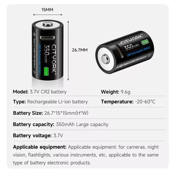 A CR2 (RCR2) újratölthető akkumulátor gyorsan feltölthető a beépített USB Type-C csatlakozón keresztül. Ez a 3,7V-os 350mAh-es lithium CR 2 akkumulátor alkalmas digitális fényképezőgépekbe, orvosi felszerelési teleszkópokba, vadászlámpákba, éjjellátokba ..stb. A rendelés elött mindenképpen ellenőrizze a teméken fetüntetett feszülséget! Méret: 26.7*15*15mm (H*W) Fehasználható hőmérsékleti tartomány: -20-60°C