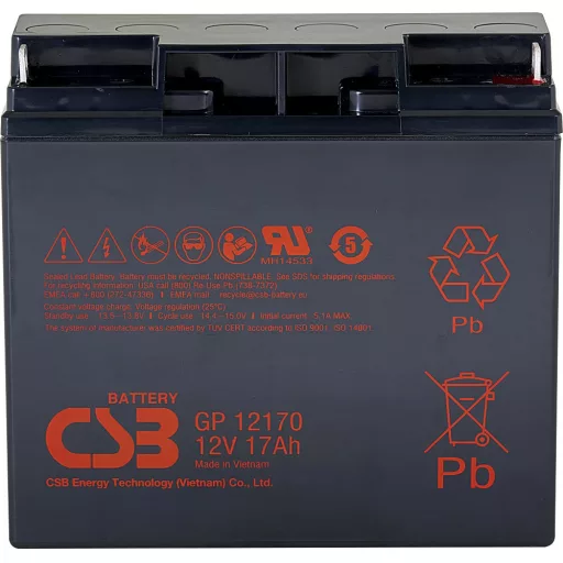 12V 17Ah CSB GP 12170 AGM technológiás, szeleppel vezérelt (VRLA) zártrendszerű gondozásmentes (zselés) ólomsavas akkumulátor. A CSB márka egy modern, csúcstechnológiájú energiatároló akkumulátor általános célú használatra mely ismételten újratölthető. Szigetelt tömítéssel vízszintes, függőleges és oldalsó irányban is elhelyezhető, biztonságát és funkcióit ez nem befolyásolja. Várható élettartama 3-5 év (Standby - Készenléti üzemmódban 5 év, 25 ⁰C), mely nagyban függ a környezeti hőmérséklettől,felhasználási területtől, terheléstől.