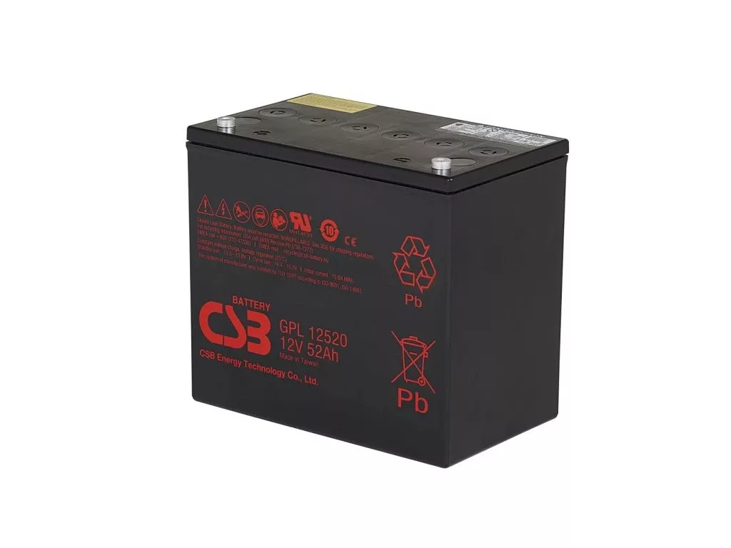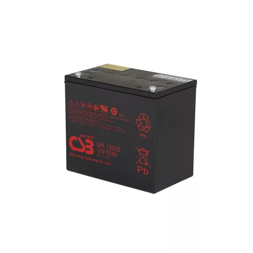 GPL12520 12V 52Ah – tartalék áramforrás, gondozásmentes, VRLA, teljesen zárt CSB Battery márkájú zselés akkumulátor. AGM technológia. Szünetmentesekhez, riasztókhoz, tűzvédelmi eszközökhöz.