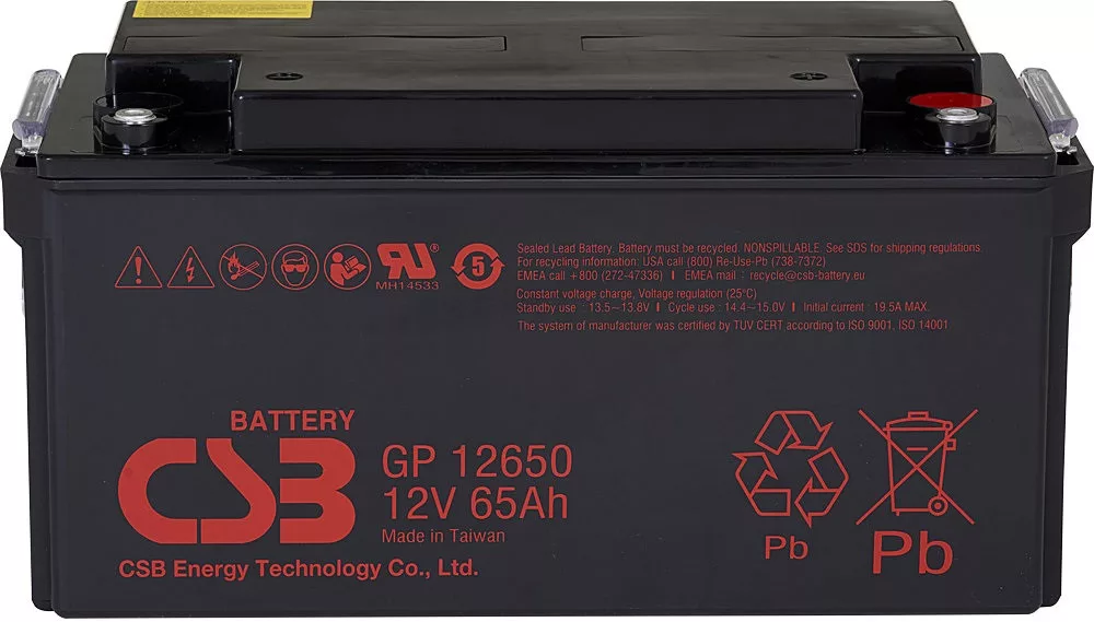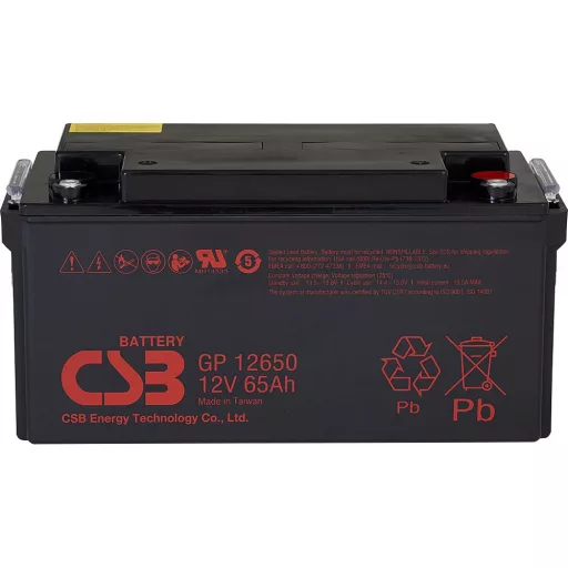 12V 65Ah CSB GP 12650 AGM technológiás, szeleppel vezérelt (VRLA) zártrendszerű gondozásmentes (zselés) ólomsavas akkumulátor. A CSB márka egy modern, csúcstechnológiájú energiatároló akkumulátor általános célú használatra mely ismételten újratölthető. Szigetelt tömítéssel vízszintes, függőleges és oldalsó irányban is elhelyezhető, biztonságát és funkcióit ez nem befolyásolja. Várható élettartama 3-5 év (Standby - Készenléti üzemmódban 5 év, 25 ⁰C), mely nagyban függ a környezeti hőmérséklettől,