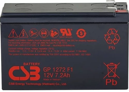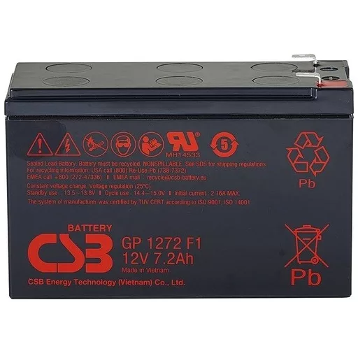12V 7Ah CSB GP 1272 F1 AGM technológiás, szeleppel vezérelt (VRLA) zártrendszerű gondozásmentes (zselés) ólomsavas akkumulátor. A CSB márka egy modern, csúcstechnológiájú energiatároló akkumulátor általános célú használatra mely ismételten újratölthető. Szigetelt tömítéssel vízszintes, függőleges és oldalsó irányban is elhelyezhető, biztonságát és funkcióit ez nem befolyásolja. Várható élettartama 3-5 év (Standby - Készenléti üzemmódban 5 év, 25 ⁰C), mely nagyban függ a környezeti hőmérséklettől,felhasználási területtől, terheléstől.