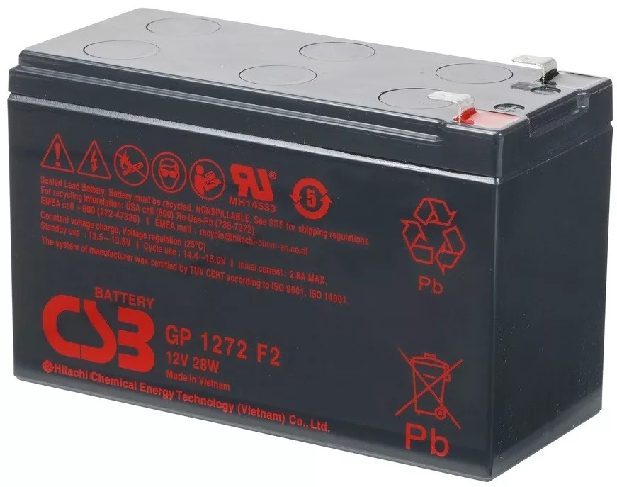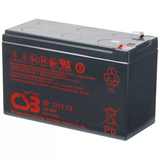 12V 7Ah CSB GP 1272 F2 28W AGM technológiás, szeleppel vezérelt (VRLA) zártrendszerű gondozásmentes (zselés) ólomsavas akkumulátor. A CSB márka egy modern, csúcstechnológiájú energiatároló akkumulátor általános célú használatra mely ismételten újratölthető. Szigetelt tömítéssel vízszintes, függőleges és oldalsó irányban is elhelyezhető, biztonságát és funkcióit ez nem befolyásolja. Várható élettartama 3-5 év (Standby - Készenléti üzemmódban 5 év, 25 ⁰C), mely nagyban függ a környezeti hőmérséklettől,felhasználási területtől, terheléstől.