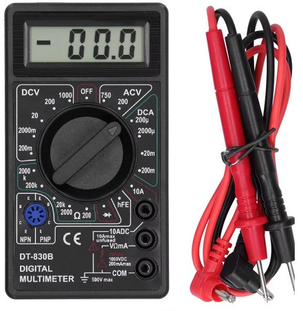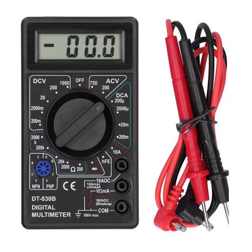 • DT830B multiméter -- Méret: Kb. 12,3x6,8x2,3 cm / 4,8x2,7x0,9 hüvelyk. Tömeg: Kb. 150 g / 5,3 uncia. Tápegység: 6F22 modell, szén elemes (nem újratölthető), 1 db 9 V-os elem (elem nem tartozék).