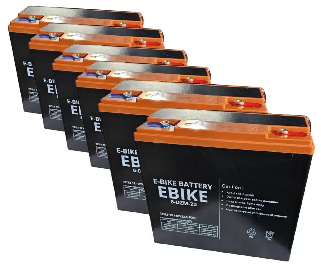 72V 22Ah E-Bike Battery (6db 12V 22Ah) 6-DZM-20/6-DZF-20 TC22-12 elektromos kerékpárba ciklikus zselés akkumulátor csavaros csatlakozással. Méret:(H)181mm x (Sz)76mm x (M)167mm Súly: nettó 7.21kg/db Garancia 12 hónap + 12 hónap jótállási idő. Várható élettartam 5 év (20 órás kisütésnél, 25°C-on). Felhasználási terület: elektromos kerékpár, e-bike, elektromos meghajtású autó, golfkocsi, kerekesszék, rokkantkocsi, tricikli...stb.