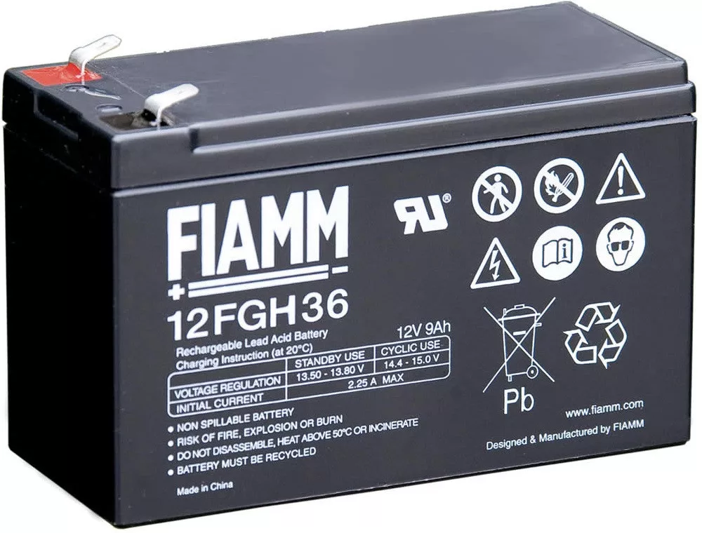 12V 9Ah FIAMM 12FGH36 zselés akkumulátor Súly: 2,7kg Várható élettartam 5 év (20 órás kisütésnél, 25°C-on) Felhasználási terület: riasztó rendszerekbe, tápegységekbe, elektromos kerékpárokba,e-bike-ba, gyerekjátékokba stb.