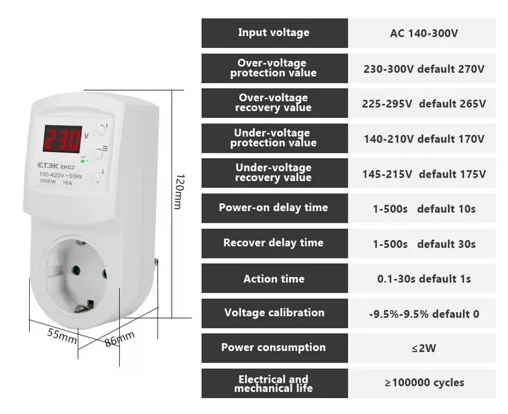Otthoni felhasználásra szánt automatikus túlfeszültségvédő hálózati aljzat, AC 220V, 16A túlfeszültségvédő. Biztosítsa tv-jét, hűtőszekrényét, PC-jét vagy egyéb hálózatról működő eszközét ezzel az egyszerő védő aljzattal.