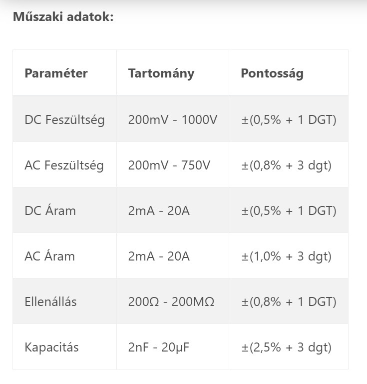 - Többfunkciós: DC és AC feszültség, DC és AC áram, ellenállás, kapacitás mérésére alkalmas.