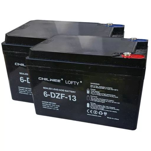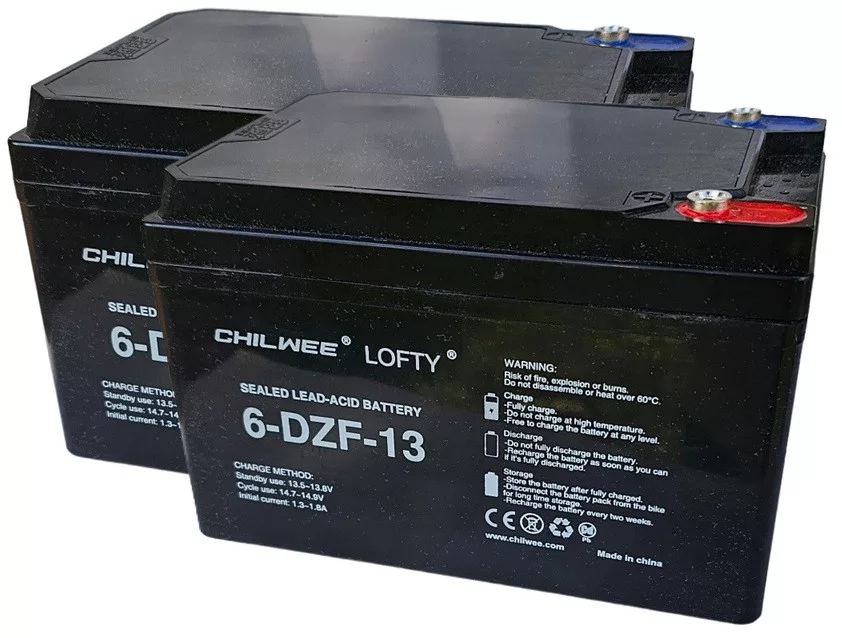 24V 13Ah CHILWEE LOFTY 6-DZF-13 (2db 12V 13Ah) típusjelölésű elektromos kerékpárba ciklikus zselés akkumulátor csavaros csatlakozási lehetőséggel. Méret: (H)151mm x (Sz)100,2mm x (M)100,4mm csavarral 104,6mm. Súly: 4,51kg/db. Várható élettartam 5 év (3 órás kisütésnél, 25°C-on) Felhasználási terület: elektromos meghajtású autó, elektromos kerékpár, e-bike, golfkocsi, kerekesszék, rokkantkocsi...stb.