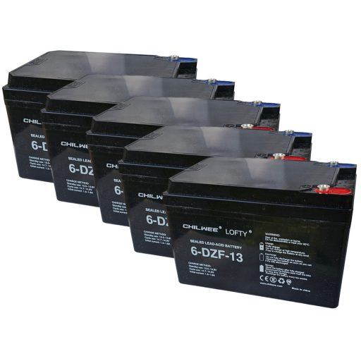 60 13Ah CHILWEE LOFTY 6-DZF-13 (5db 12V 13Ah) típusjelölésű elektromos kerékpárba ciklikus zselés akkumulátor csavaros csatlakozási lehetőséggel. Méret: (H)151mm x (Sz)100,2mm x (M)100,4mm csavarral 104,6mm. Súly: 4,51kg/db. Várható élettartam 5 év (3 órás kisütésnél, 25°C-on) Felhasználási terület: elektromos meghajtású autó, elektromos kerékpár, e-bike, golfkocsi, kerekesszék, rokkantkocsi...stb.
