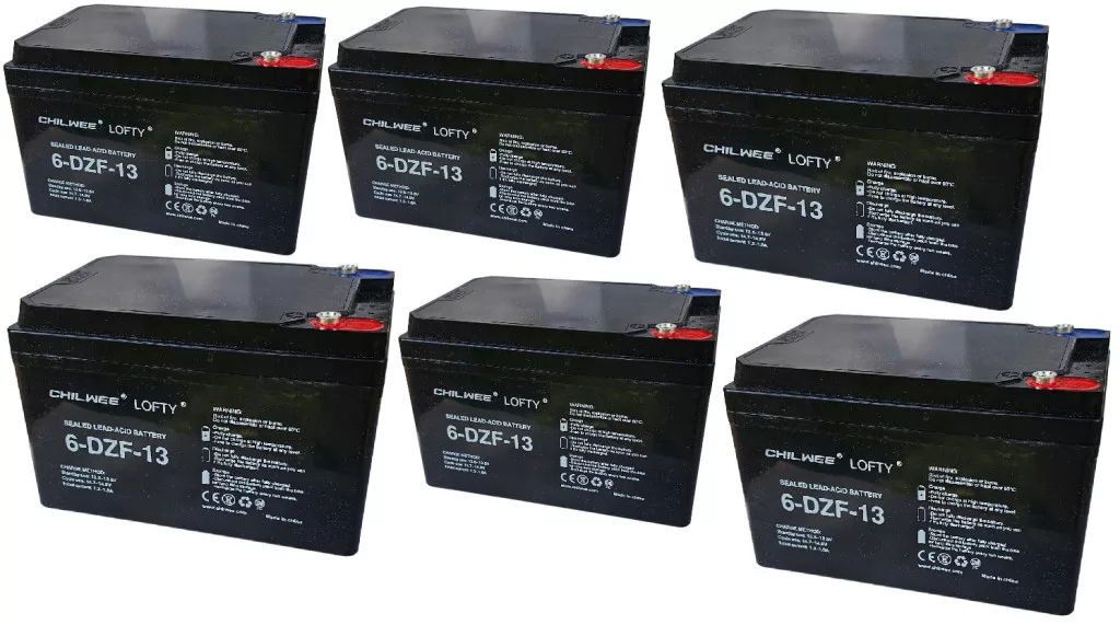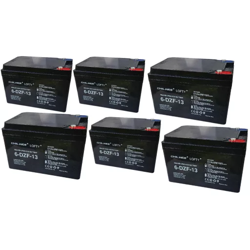 72V 13Ah (6db 12V 13Ah) LOFTY 6-DZF-13 típusjelölésű elektromos kerékpárba ciklikus zselés akkumulátor csavaros csatlakozási lehetőséggel. Méret: (H)151mm x (Sz)100,2mm x (M)100,4mm csavarral 104,6mm. Súly: 4,145kg/db. Várható élettartam 5 év (3 órás kisütésnél, 25°C-on) Felhasználási terület: elektromos meghajtású autó, elektromos kerékpár, e-bike, golfkocsi, kerekesszék, rokkantkocsi...stb.