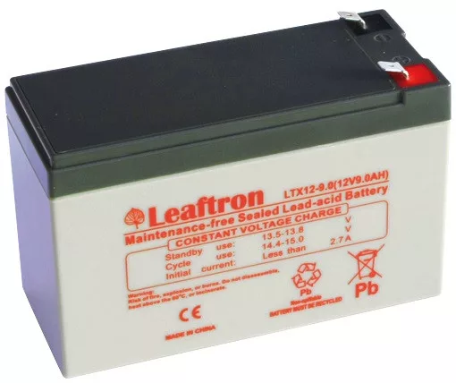 12V 9Ah Leaftron LTX12-9 T2 AGM technológiás, szeleppel vezérelt (VRLA) zártrendszerű gondozásmentes (zselés) ólomsavas akkumulátor. A Leaftron márka egy megbízható energiatároló akkumulátor általános célú használatra mely ismételten újratölthető. Szigetelt tömítéssel vízszintes, függőleges és oldalsó irányban is elhelyezhető, biztonságát és funkcióit ez nem befolyásolja. Várható élettartama 3-5 év (Standby - Készenléti üzemmódban 5 év, 25 ⁰C), mely nagyban függ a környezeti hőmérséklettől,felhasználási területtől, terheléstől. Felhasználási terület: riasztó és tűzvédelmi rendszerek, tápegységek,etetőhajók, gyerekjátékok, lámpák ... stb.