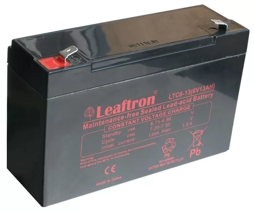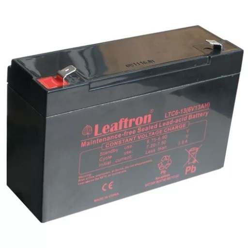6V 13Ah Leaftron LTC6-13 AGM technológiás, szeleppel vezérelt (VRLA) zártrendszerű gondozásmentes (zselés) ólomsavas akkumulátor. A Leaftron márka egy megbízható energiatároló akkumulátor általános célú használatra mely ismételten újratölthető. Szigetelt tömítéssel vízszintes, függőleges és oldalsó irányban is elhelyezhető, biztonságát és funkcióit ez nem befolyásolja. Várható élettartama 3-5 év (Standby - Készenléti üzemmódban 5 év, 25 ⁰C), mely nagyban függ a környezeti hőmérséklettől,felhasználási területtől, terheléstől. Felhasználási terület: riasztó és tűzvédelmi rendszerek, tápegységek,etetőhajók, gyerekjátékok, lámpák ... stb.