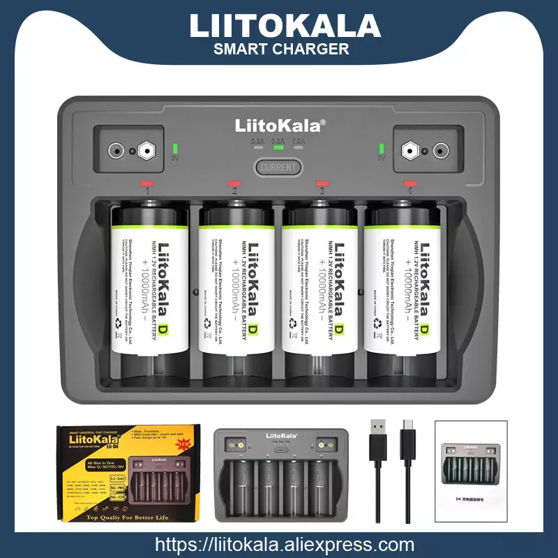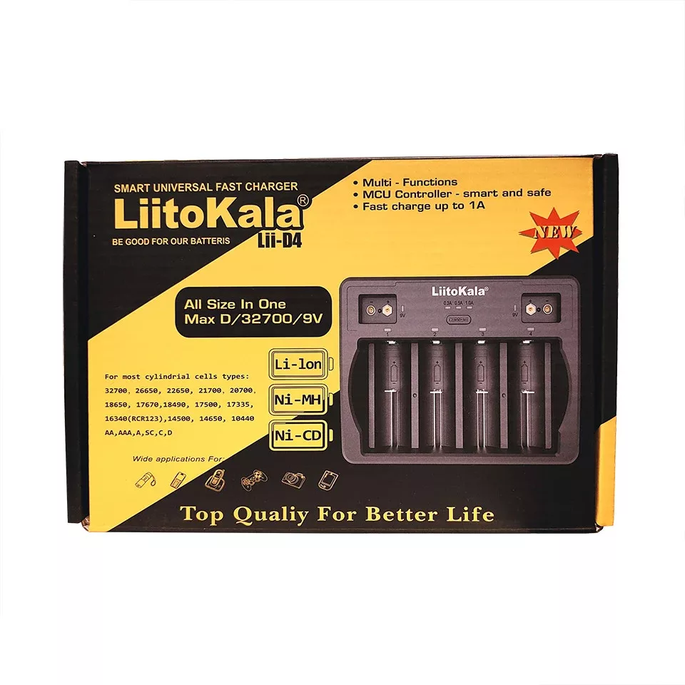 LiitoKala Lii-D4 9V 26650 18650 21700 18500 26700 16340 22650 AA AAA C SC D 3.7V 1.2V Lithium NiMH univerzális elem töltő.