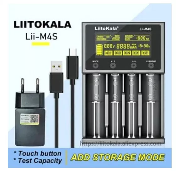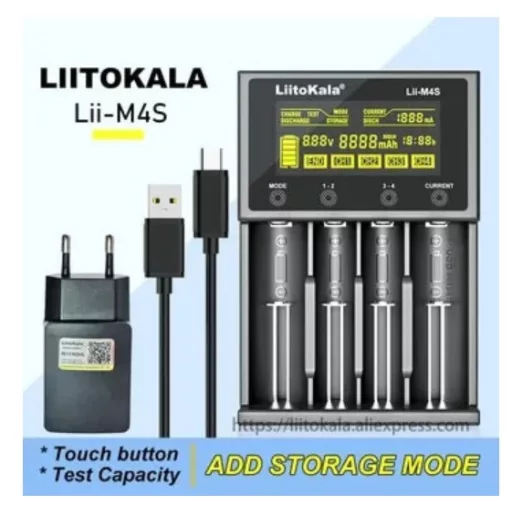 - LiitoKala Lii-M4S négycsatornás Li-Ion (3,6-3,7V) és 1,2V NiMh/NiCd intelligens akkumulátor töltő, LCD kijelzővel,kapacitás mérési funkcióval
