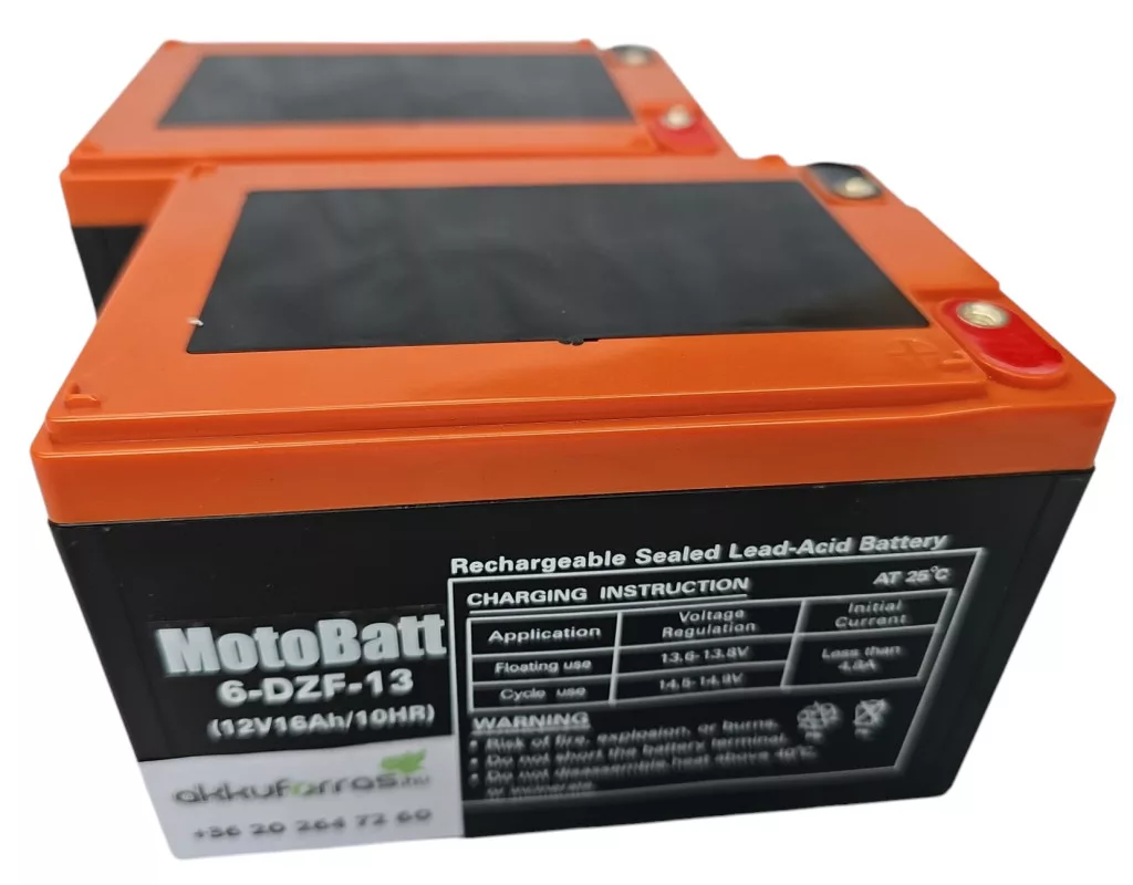 24V 16Ah (2db 12V 16Ah) MotoBatt 6-DZF-13 vagy 6-DZM-12/6-DZF-12 típusjelölésű elektromos kerékpárba ciklikus zselés akkumulátor csavaros csatlakozási lehetőséggel. Méret: (H)151mm x (Sz)100,2mm x (M)100,4mm csavarral 104,6mm. Súly: 4,51kg/db. Várható élettartam 5 év (3 órás kisütésnél, 25°C-on) Felhasználási terület: elektromos meghajtású autó, elektromos kerékpár, e-bike, golfkocsi, kerekesszék, rokkantkocsi...stb.
