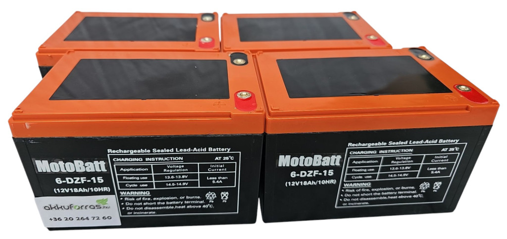 48V 18Ah (4db 12V 18Ah) MotoBatt 6-DZF-15 vagy 6-DZM-12/6-DZF-12 típusjelölésű elektromos kerékpárba ciklikus zselés akkumulátor csavaros csatlakozási lehetőséggel. Méret: (H)151mm x (Sz)100,2mm x (M)100,4mm csavarral 104,6mm. Súly: 4,51kg/db. Várható élettartam 5 év (3 órás kisütésnél, 25°C-on) Felhasználási terület: elektromos meghajtású autó, elektromos kerékpár, e-bike, golfkocsi, kerekesszék, rokkantkocsi...stb.