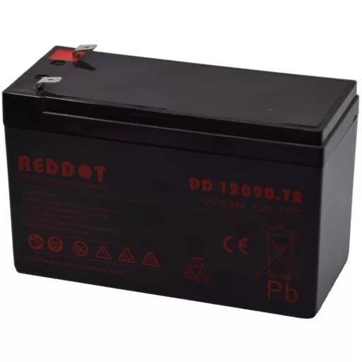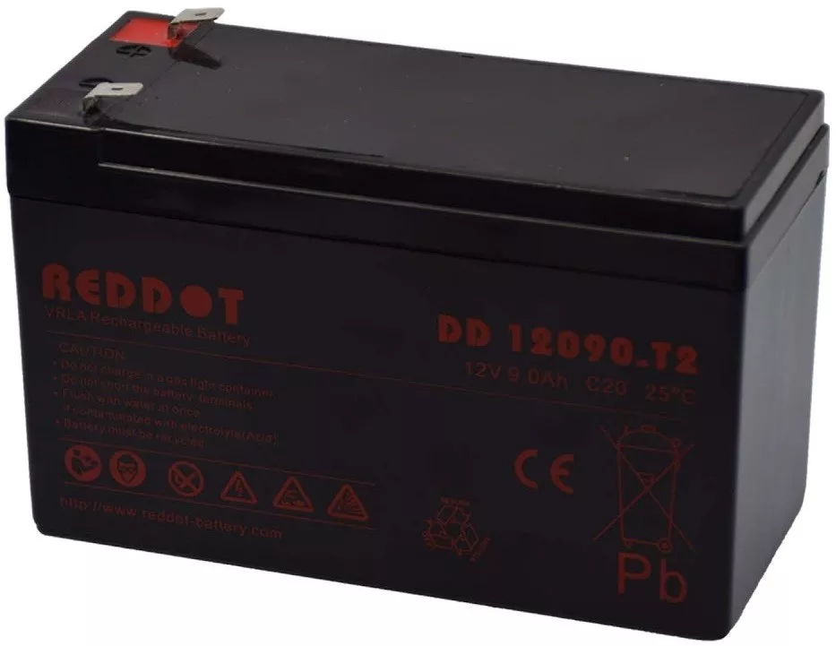 A REDDOT DD12090 T2 (széles sarus) 12V 9Ah zselés akkumulátor, gondozásmentes, szeleppel vezérelt ólomsavas (VRLA) AGM akkumulátor. Elsősorban készenléti (standby) üzemmódra tervezték, így ideális szünetmentes tápegységekhez (UPS), riasztórendszerekhez, vészvilágításokhoz, szirénákhoz, távközlési eszközökhöz és orvosi műszerekhez.. Élettartam kb. 3-5 év.