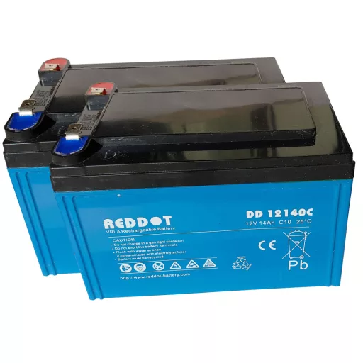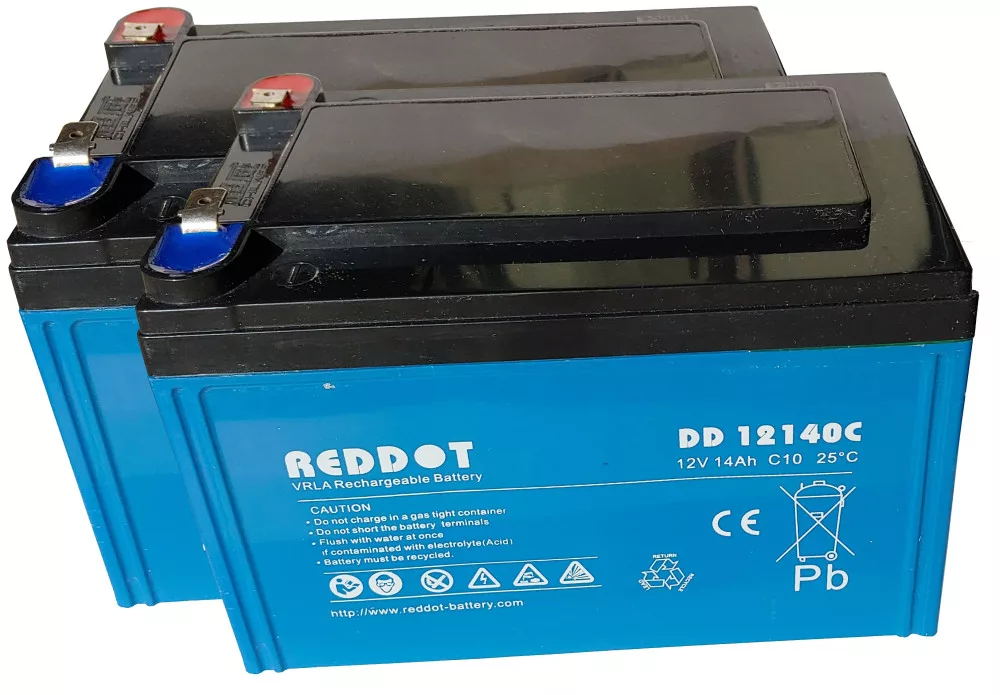 24V 14Ah (2db 12V 14Ah) RedDot DD12140C típusjelölésű elektromos kerékpárba ciklikus zselés akkumulátor csúszósaru csatlakozási lehetőséggel. Méret: (H)151mm x (Sz)100,2mm x (M)100,4mm saruval 104,6mm. Súly: 4,51kg/db. Várható élettartam 5 év (3 órás kisütésnél, 25°C-on) Felhasználási terület: elektromos meghajtású autó, elektromos kerékpár, e-bike, golfkocsi, kerekesszék, rokkantkocsi...stb.