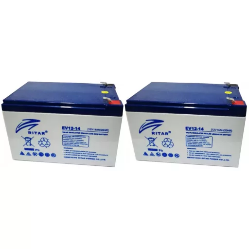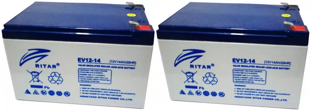 24V 14Ah Ritar EV12-14 (2db 12V 14Ah) 6-DZM-12/6-DZF-12 vagy 6-DZM-14 típusjelölésű elektromos kerékpárba ciklikus zselés akkumulátor csúszósaru csatlakozási lehetőséggel. Méret: (H)151mm x (Sz)100,2mm x (M)100,4mm saruval 104,6mm. Súly: 4,51kg/db. Várható élettartam 5 év (3 órás kisütésnél, 25°C-on) Felhasználási terület: elektromos meghajtású autó, elektromos kerékpár, e-bike, golfkocsi, kerekesszék, rokkantkocsi...stb.