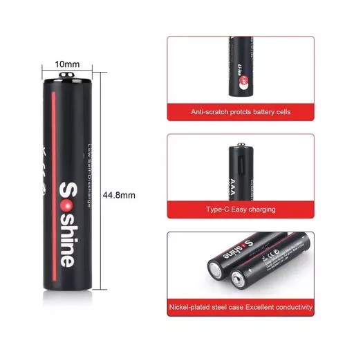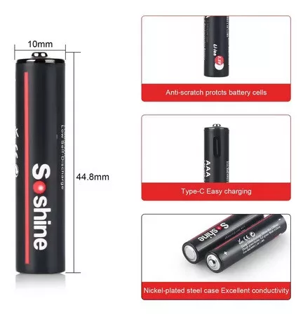 Soshine AAA 1,5V 700mAh 1100mWh védelemmel ellátott tölthető mikro elem méretű Lithium akkumulátor Méret: 10mm x 44,8mm Súly: 8,5g Max. folyamatos terhelhetőség 0,3 Töltési ciklusok száma megközelítőleg 1000x. A töltés kizárólag 1,5V-os töltővel lehet!