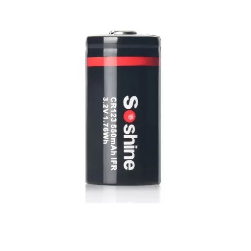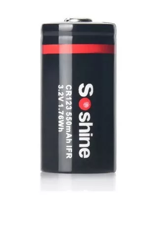SOSHINE RCR123A 3,2V 550mAh (1,76Wh) kapacitású LiFePO4 akkumulátor. Egyéb megnevezés: 16340 Méret: 16mm x 32mm