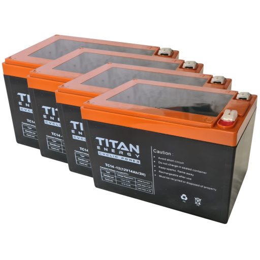 48V 14Ah TitanEnergy TC14-12 (4db 12V 14Ah) 6-DZM-12/6-DZF-12 vagy 6-DZM-14 típusjelölésű elektromos kerékpárba ciklikus zselés akkumulátor sarus csatlakozási lehetőséggel. Méret: (H)151mm x (Sz)100,2mm x (M)100,4mm saruval 104,6mm. Súly: 4,51kg/db. Várható élettartam 5 év (3 órás kisütésnél, 25°C-on) Felhasználási terület: elektromos meghajtású autó, elektromos kerékpár, e-bike, golfkocsi, kerekesszék, rokkantkocsi...stb.