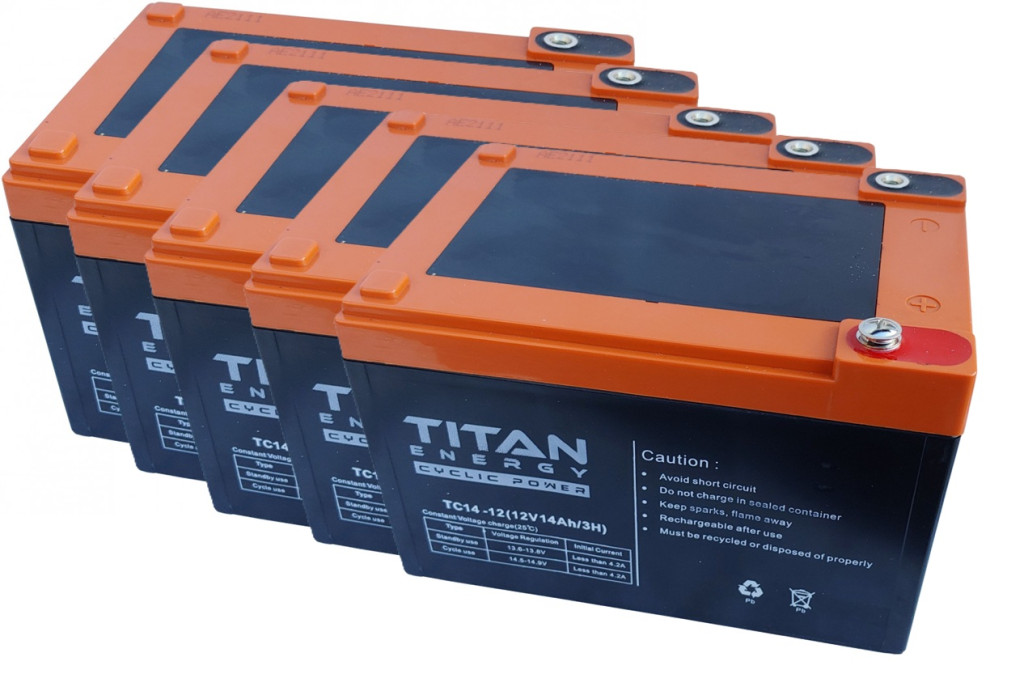 60V 14Ah TitanEnergy TC14-12 (5db 12V 14Ah) 6-DZM-12/6-DZF-12 vagy 6-DZM-14 típusjelölésű elektromos kerékpárba ciklikus zselés akkumulátor csavaros csatlakozási lehetőséggel. Méret: (H)151mm x (Sz)100,2mm x (M)100,4mm csavarral 104,6mm. Súly: 4,51kg/db. Várható élettartam 5 év (3 órás kisütésnél, 25°C-on) Felhasználási terület: elektromos meghajtású autó, elektromos kerékpár, e-bike, golfkocsi, kerekesszék, rokkantkocsi...stb.