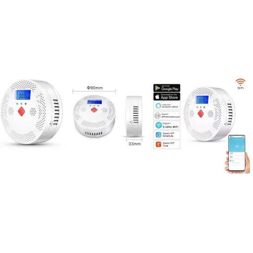 Ez a Wi-Fi-s, LCD-s intelligens szén-monoxid érzékelő-riasztó 85 dB hanggal figyelmeztet otthon a beltérben probléma esetén.
