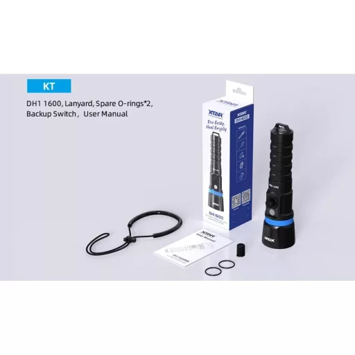 Az XTAR DH1 1600 Hunter professzionális búvárlámpa a legújabb, legmagasabb osztályú Luminus SST-40 diódát használja, amelynek fényereje akár 1600 lumen is lehet. A dióda hideg fehér fényt bocsát ki. Kiváló tömítőképessége akár 100 méteres merülési mélységet is biztosít . Kompatibilis a 21700 méretű Li-ion akkukkal. A test felületeloxált alumíniumból készült , perforált felülettel, strapabíró anódos bevonattal és recézett kialakítással rendelkezik, amely jó és biztonságos fogást biztosít. A jó elektromos érintkezés biztosítása érdekében az elemérintkezők antioxidáns anyagokból készültek, és emellett aranyozottak. A fordított polaritás elleni védelem, a stabilizáló fényteljesítmény-szabályozás, a gurulásgátló, a csukló pántos rögzítés és a mágneses taktikai kapcsoló kiemeli a gyártó professzionális hozzáállását a termékekhez. A 4900 mAh-s Li-ION 21700 akkumulátorral működő lámpa a legmagasabb módban – 1600 lumen – 2,5 órás üzemidőt ér el. A zseblámpához tartozik egy csukló pánt és tartalék O-gyűrűk. LED-es akkumulátortöltés-jelzővel is rendelkezik.