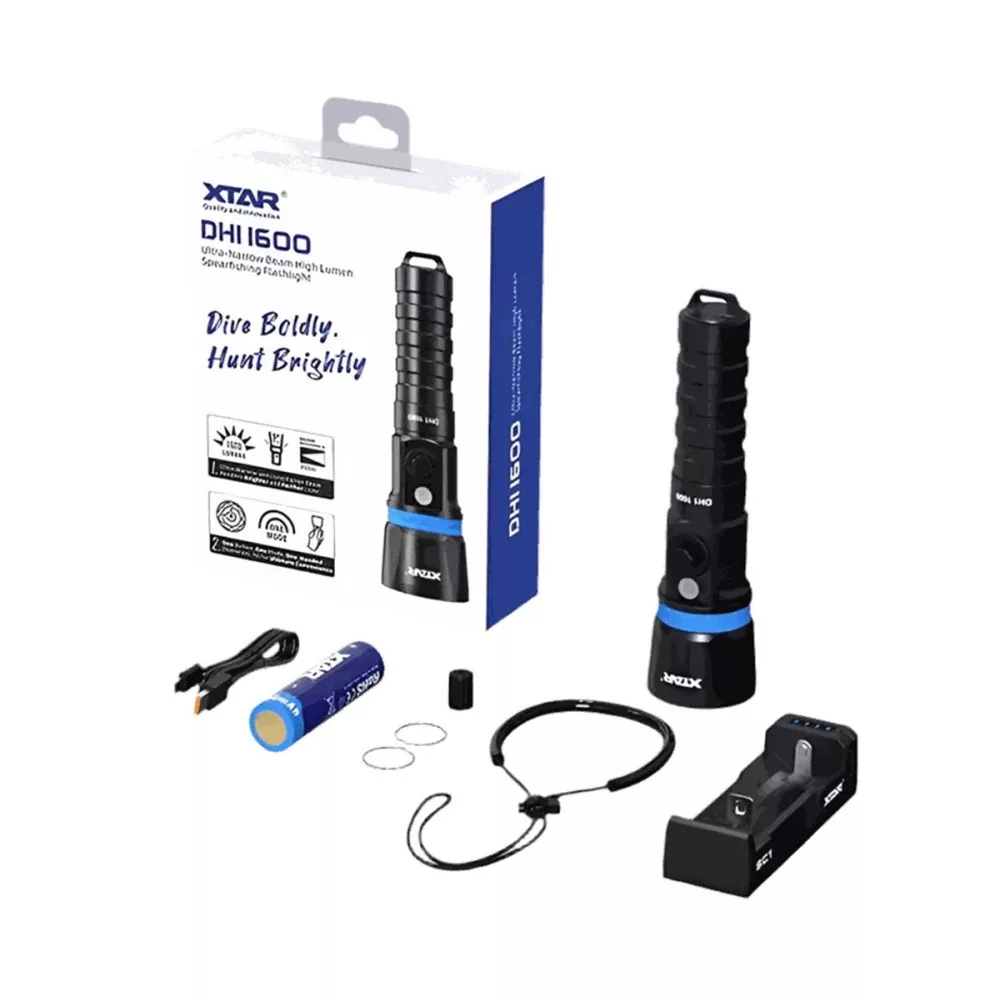 Az XTAR DH1 1600 Hunter professzionális búvárlámpa a legújabb, legmagasabb osztályú Luminus SST-40 diódát használja, amelynek fényereje akár 1600 lumen is lehet. A dióda hideg fehér fényt bocsát ki. Kiváló tömítőképessége akár 100 méteres merülési mélységet is biztosít . Kompatibilis a 21700 méretű Li-ion akkukkal. A test felületeloxált alumíniumból készült , perforált felülettel, strapabíró anódos bevonattal és recézett kialakítással rendelkezik, amely jó és biztonságos fogást biztosít. A jó elektromos érintkezés biztosítása érdekében az elemérintkezők antioxidáns anyagokból készültek, és emellett aranyozottak. A fordított polaritás elleni védelem, a stabilizáló fényteljesítmény-szabályozás, a gurulásgátló, a csukló pántos rögzítés és a mágneses taktikai kapcsoló kiemeli a gyártó professzionális hozzáállását a termékekhez. A 4900 mAh-s Li-ION 21700 akkumulátorral működő lámpa a legmagasabb módban – 1600 lumen – 2,5 órás üzemidőt ér el. A zseblámpához tartozik egy SC1 töltő, egy 21700-as Li-ION akkumulátor PCM-mel, egy USB-C csatlakozókábel, egy csukló pánt és tartalék O-gyűrűk. LED-es akkumulátortöltés-jelzővel is rendelkezik.