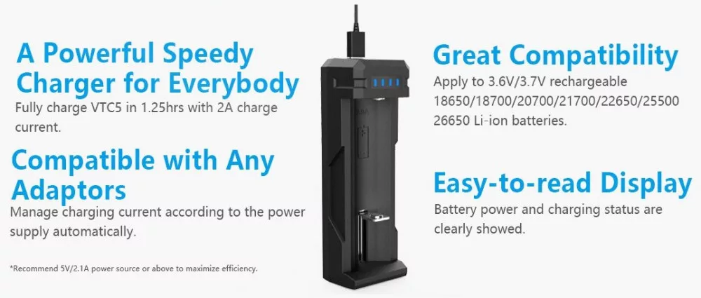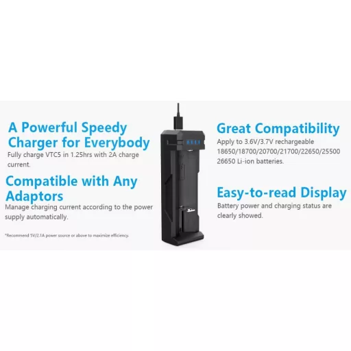 Xtar SC1 1db 18650-es intelligens töltésvezérlésű Li-ion akkumulátor töltő termikus védelemmel ellátva. Feszültség: 4.2V Töltőáram 2 A Kijlező:LED Piros LED bekapcsolva: az akkumulátor töltés alatt van. Zöld LED bekapcsolva: az alábbi állapotok közül az egyik: Töltés befejezve, nincs akkumulátor behelyezve, aktiválás alatt, érintkezési hiba, rövidzár Nincs LED bekapcsolva: az akkumulátor polaritása fordított Csatlakozó: mikro USB Akkumulátor típusa: Li-ion Tölthető akkumulátorok mérete: 18650, 18700, 20700, 21700, 22650, 25500, 26650 Működési hőmérséklet:0-40C Súly: 37g Garancia: 6 hónap