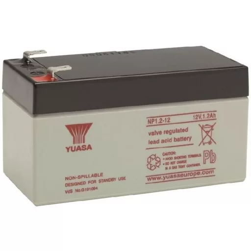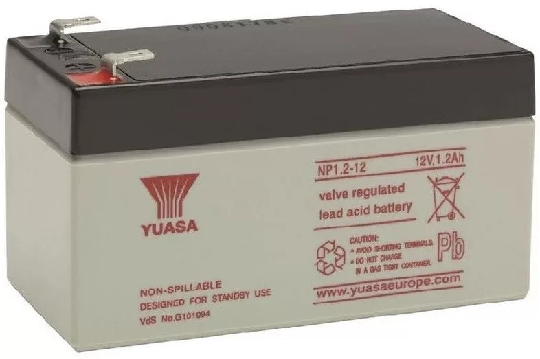 12V 1,2Ah YUASA NP1.2-12 zárt gondozásmentes AGM technológiás, szeleppel vezérelt VRLA zselés ólomsavas akkumulátor. VdS minősítés (VdS No: G 189099) mely egy modern, csúcstechnológiájú energiatároló akkumulátor általános célú, ismételten újratölthető használatra. A szigetelt tömítéssel vízszintes, függőleges és oldalsó irányban is elhelyezhető, biztonságát és funkcióit ez nem befolyásolja. Várható élettartama 3-5 év (Standby - Készenléti üzemmódban 5 év, 20 ⁰C), mely nagyban függ a környezeti hőmérséklettől, felhasználási területtől, terheléstől.