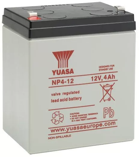 12V 4Ah YUASA NP4-12 zárt gondozásmentes AGM technológiás, szeleppel vezérelt VRLA zselés ólomsavas akkumulátor. VdS minősítés (VdS No: G 189099) mely egy modern, csúcstechnológiájú energiatároló akkumulátor általános célú, ismételten újratölthető használatra. A szigetelt tömítéssel vízszintes, függőleges és oldalsó irányban is elhelyezhető, biztonságát és funkcióit ez nem befolyásolja. Várható élettartama 3-5 év (Standby - Készenléti üzemmódban 5 év, 20 ⁰C), mely nagyban függ a környezeti hőmérséklettől, felhasználási területtől, terheléstől.