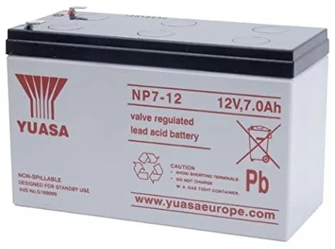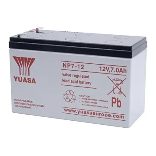 12V 7Ah YUASA NP7-12 zárt gondozásmentes AGM technológiás, szeleppel vezérelt VRLA zselés ólomsavas akkumulátor. VdS minősítés (VdS No: G 189099) mely egy modern, csúcstechnológiájú energiatároló akkumulátor általános célú, ismételten újratölthető használatra. A szigetelt tömítéssel vízszintes, függőleges és oldalsó irányban is elhelyezhető, biztonságát és funkcióit ez nem befolyásolja. Várható élettartama 3-5 év (Standby - Készenléti üzemmódban 5 év, 20 ⁰C), mely nagyban függ a környezeti hőmérséklettől, felhasználási területtől, terheléstől.