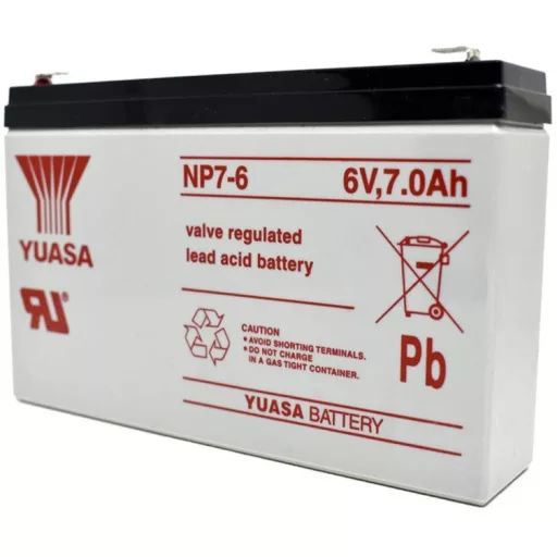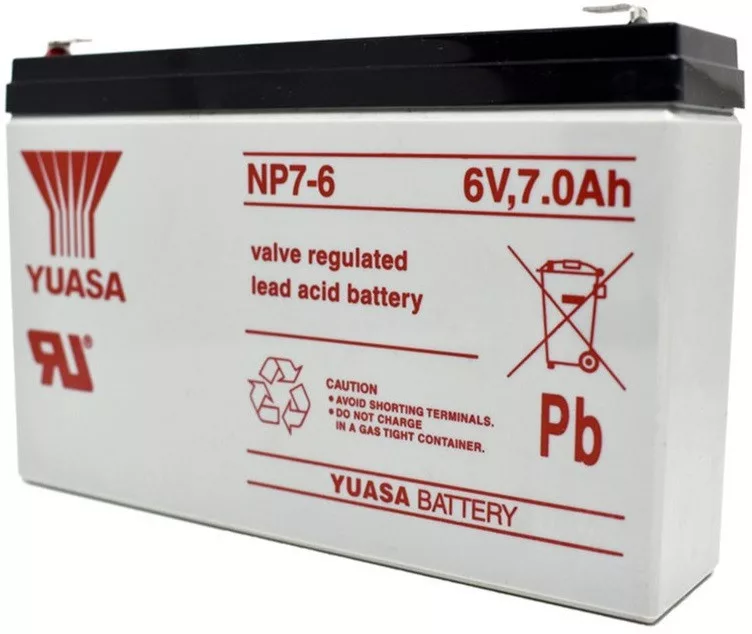 6V 7Ah YUASA NP7-6 zárt gondozásmentes AGM technológiás, szeleppel vezérelt VRLA zselés ólomsavas akkumulátor. VdS minősítés (VdS No: G 189099) mely egy modern, csúcstechnológiájú energiatároló akkumulátor általános célú, ismételten újratölthető használatra. A szigetelt tömítéssel vízszintes, függőleges és oldalsó irányban is elhelyezhető, biztonságát és funkcióit ez nem befolyásolja. Várható élettartama 3-5 év (Standby - Készenléti üzemmódban 5 év, 20 ⁰C), mely nagyban függ a környezeti hőmérséklettől, felhasználási területtől, terheléstől.