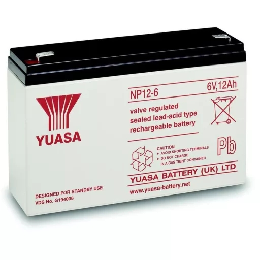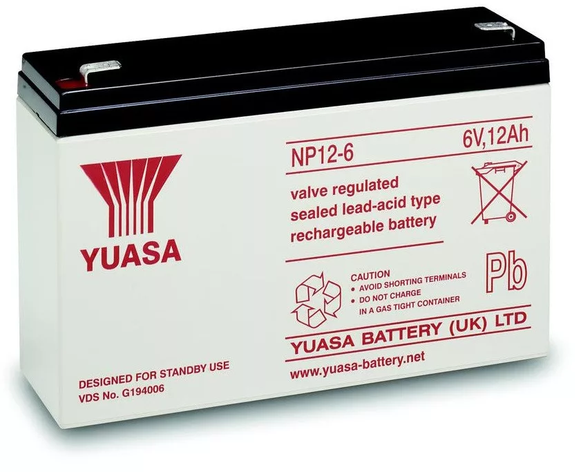 6V 12Ah YUASA NP12-6 zárt gondozásmentes AGM technológiás, szeleppel vezérelt VRLA zselés ólomsavas akkumulátor. VdS minősítés (VdS No: G 189099) mely egy modern, csúcstechnológiájú energiatároló akkumulátor általános célú, ismételten újratölthető használatra. A szigetelt tömítéssel vízszintes, függőleges és oldalsó irányban is elhelyezhető, biztonságát és funkcióit ez nem befolyásolja. Várható élettartama 3-5 év (Standby - Készenléti üzemmódban 5 év, 20 ⁰C), mely nagyban függ a környezeti hőmérséklettől, felhasználási területtől, terheléstől.