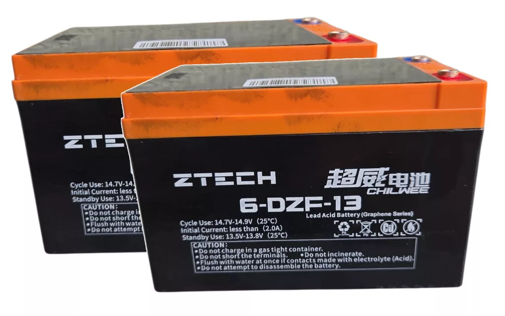 24V 13Ah (2db 12V 13Ah) CHILWEE ZTECH 6-DZF-13 típusjelölésű Graphene Series, elektromos kerékpárba ciklikus zselés akkumulátor csavaros csatlakozási lehetőséggel. Méret: (H)151mm x (Sz)100,2mm x (M)100,4mm csavarral 104,6mm. Súly: 4,315kg/db. Várható élettartam 5 év (3 órás kisütésnél, 25°C-on) Felhasználási terület: elektromos meghajtású autó, elektromos kerékpár, e-bike, golfkocsi, kerekesszék, rokkantkocsi...stb.