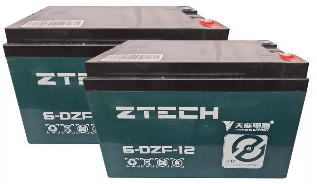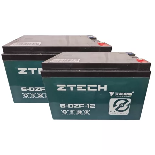 24V 12Ah ZTECH 6-DZF-12 (2db 12V 12Ah) vagy 6-DZM-12 típusjelölésű elektromos kerékpárba ciklikus zselés akkumulátor csavaros csatlakozási lehetőséggel. Méret: (H)151mm x (Sz)100,2mm x (M)100,4mm csavarral 104,6mm. Súly: 4,51kg/db. Várható élettartam 5 év (3 órás kisütésnél, 25°C-on) Felhasználási terület: elektromos meghajtású autó, elektromos kerékpár, e-bike, golfkocsi, kerekesszék, rokkantkocsi...stb.