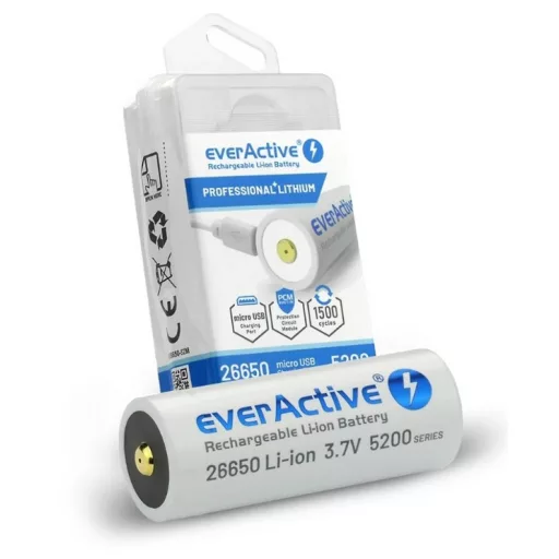 Az everActive termékcsalád Professional+Lithium széria tagja. A 26650-es akkumulátor PCM elektronikus védelemmel van ellátva, amely megvédi az akkumulátort az extrém kisüléstől, túltöltéstől és rövidzárlattól. Ideális zseblámpákban, éjjellátó szemüvegekben és más, cserélhető 26650-as elemmel rendelkező eszközökben való használatra. A termék 30%-ra előre feltöltve kerül csomagolásra.