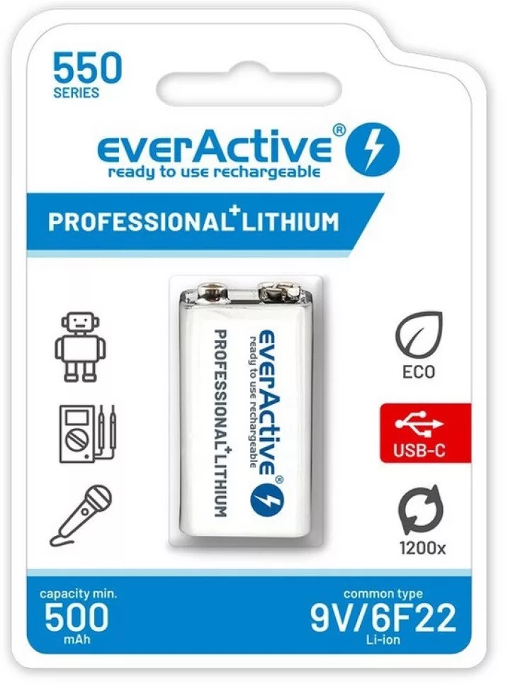everActive 550mAh HR22 USB-C Lithium akkumulátor 9V tölthető elem
